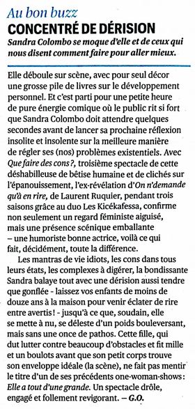 drôle et sérieux à la fois, je suis personnellement passée du rire au larme, on aime écouter Sandra qui nous parle de la vie en toute sincérité ! Je recommande